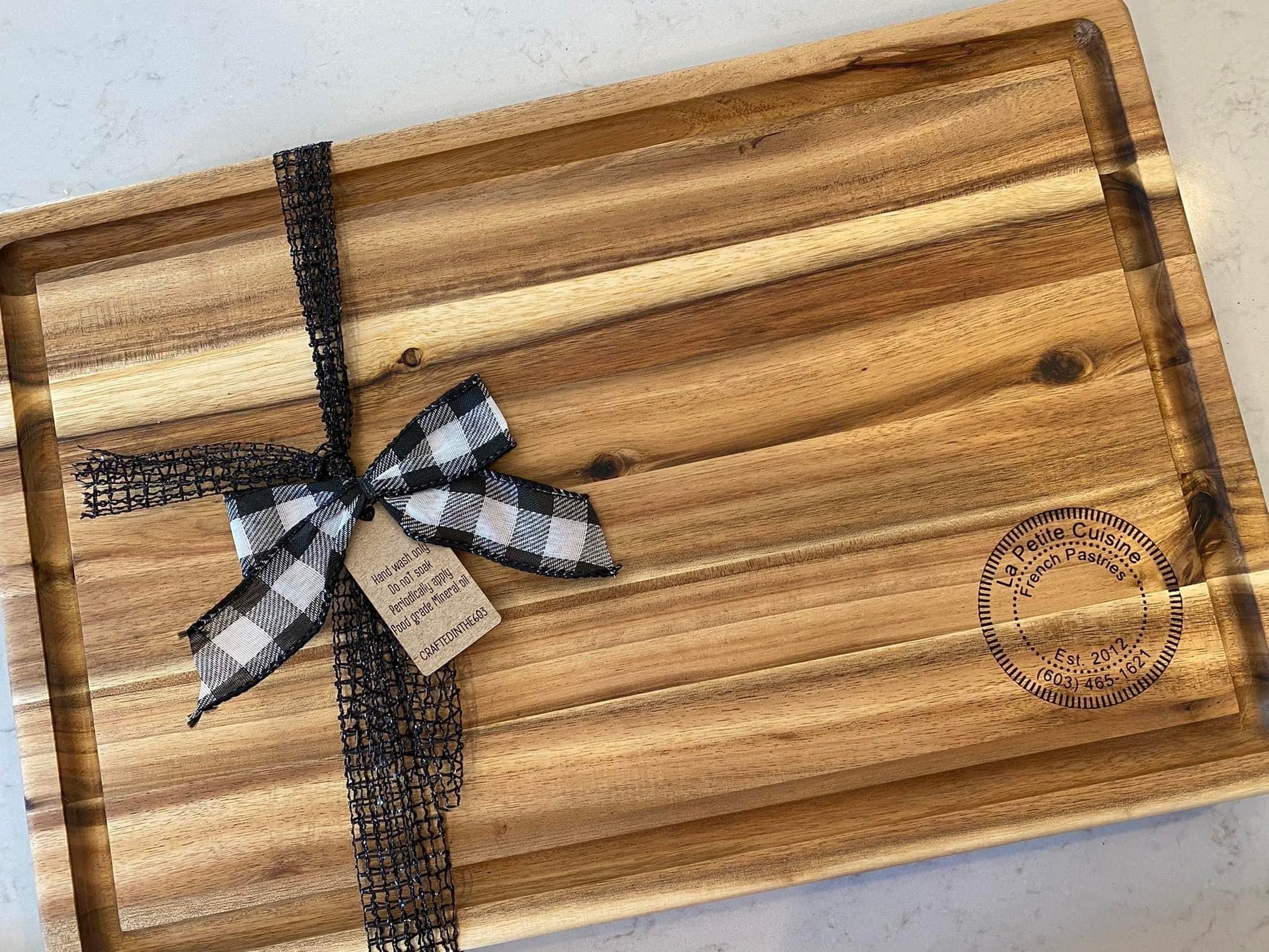 These Acacia chopping blocks are top quality. They measure 18"x12"x1.5. The basic board is as pictured with Family name. Please be sure to include name in Personalization field. I can also do a custom logo/design so feel free to reach out about that as well.