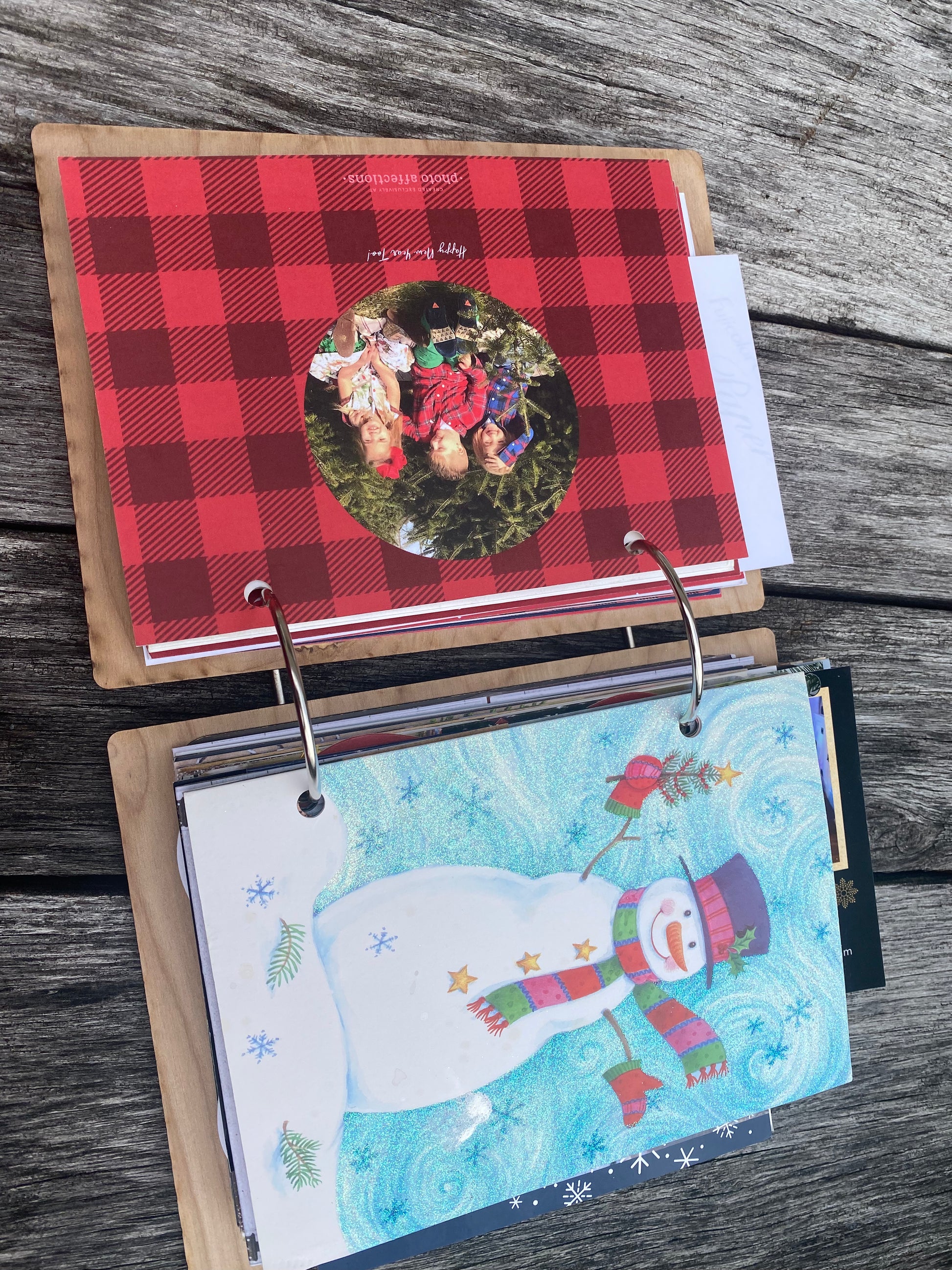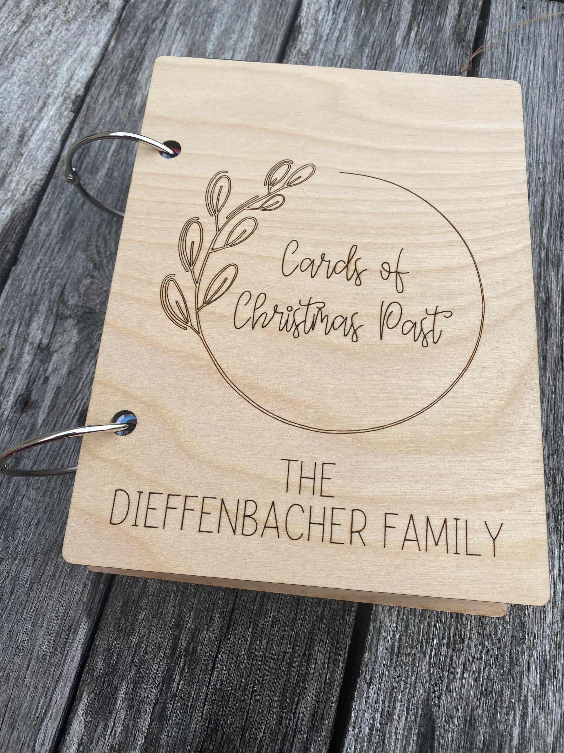No need to throw away the cards you receive. Save them and create a book to display during the holidays. The wood “book” is laser engraved and can be personalized with name or just the year or both! Includes the front, back, and binder rings. All you need to add are your holiday cards. Just be sure to note what you want in the personalization field.