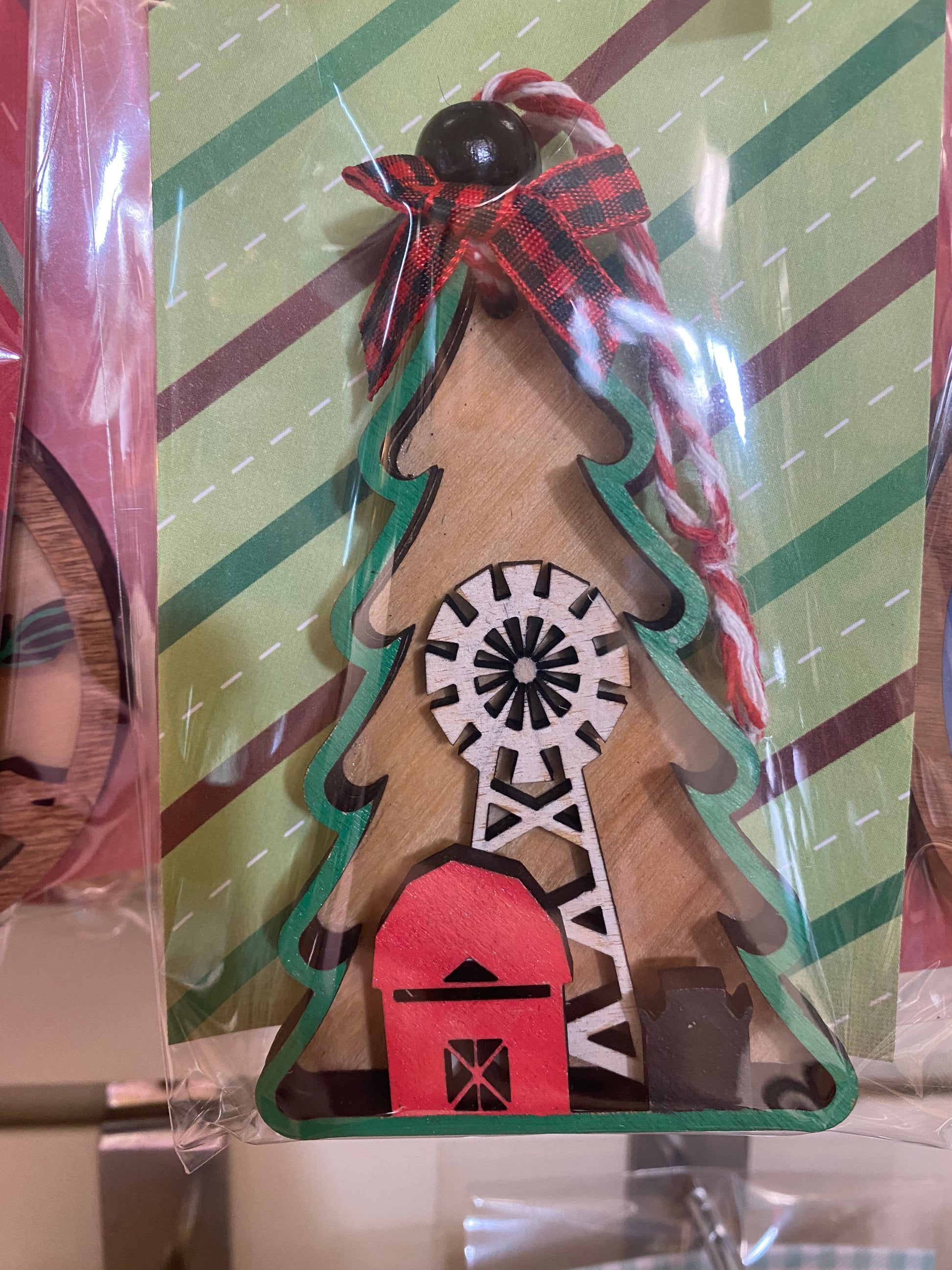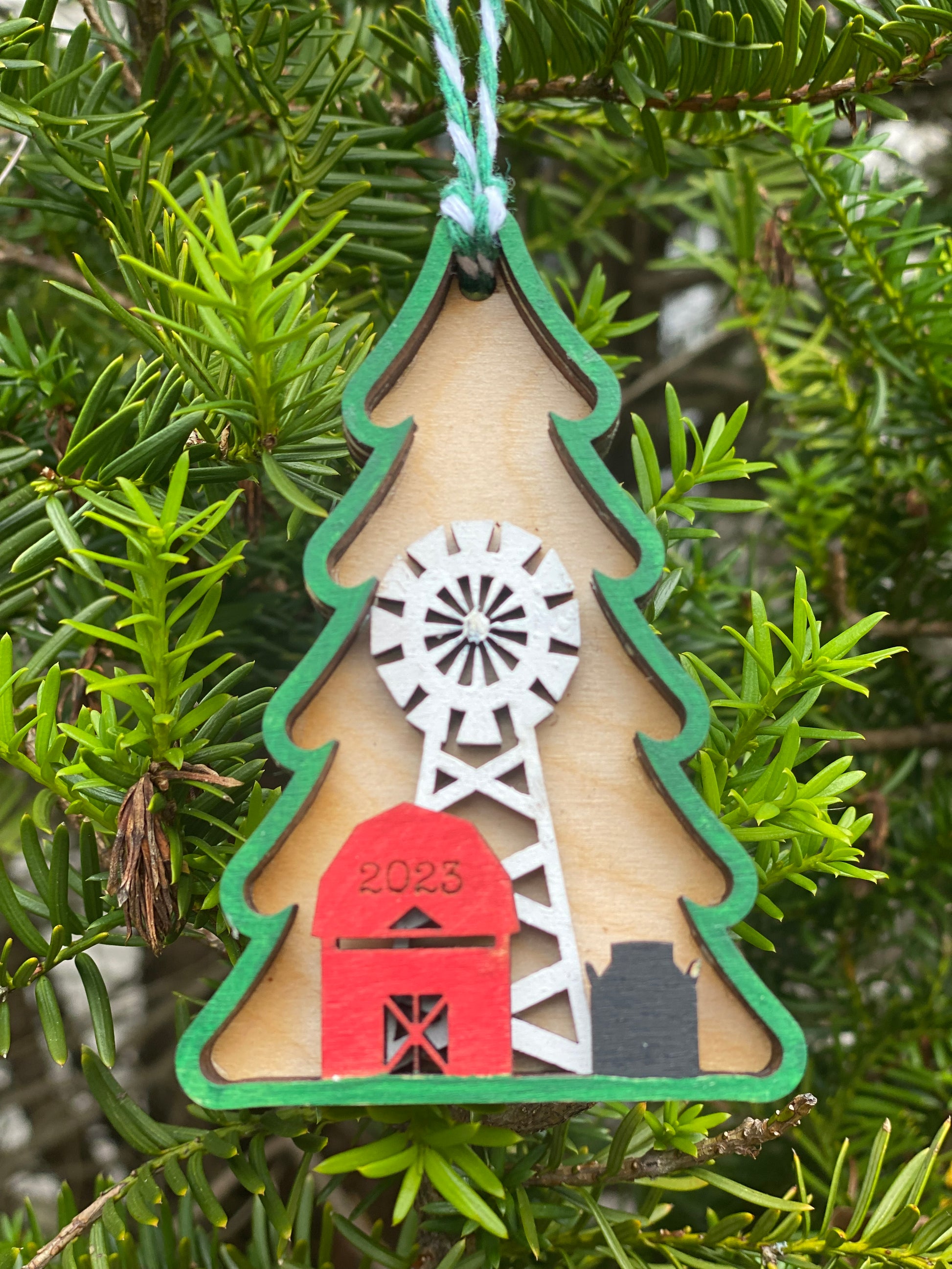 Hand painted triple layer farm ornament. Current year will be engraved in the barn. Can also put family or town name in barn.