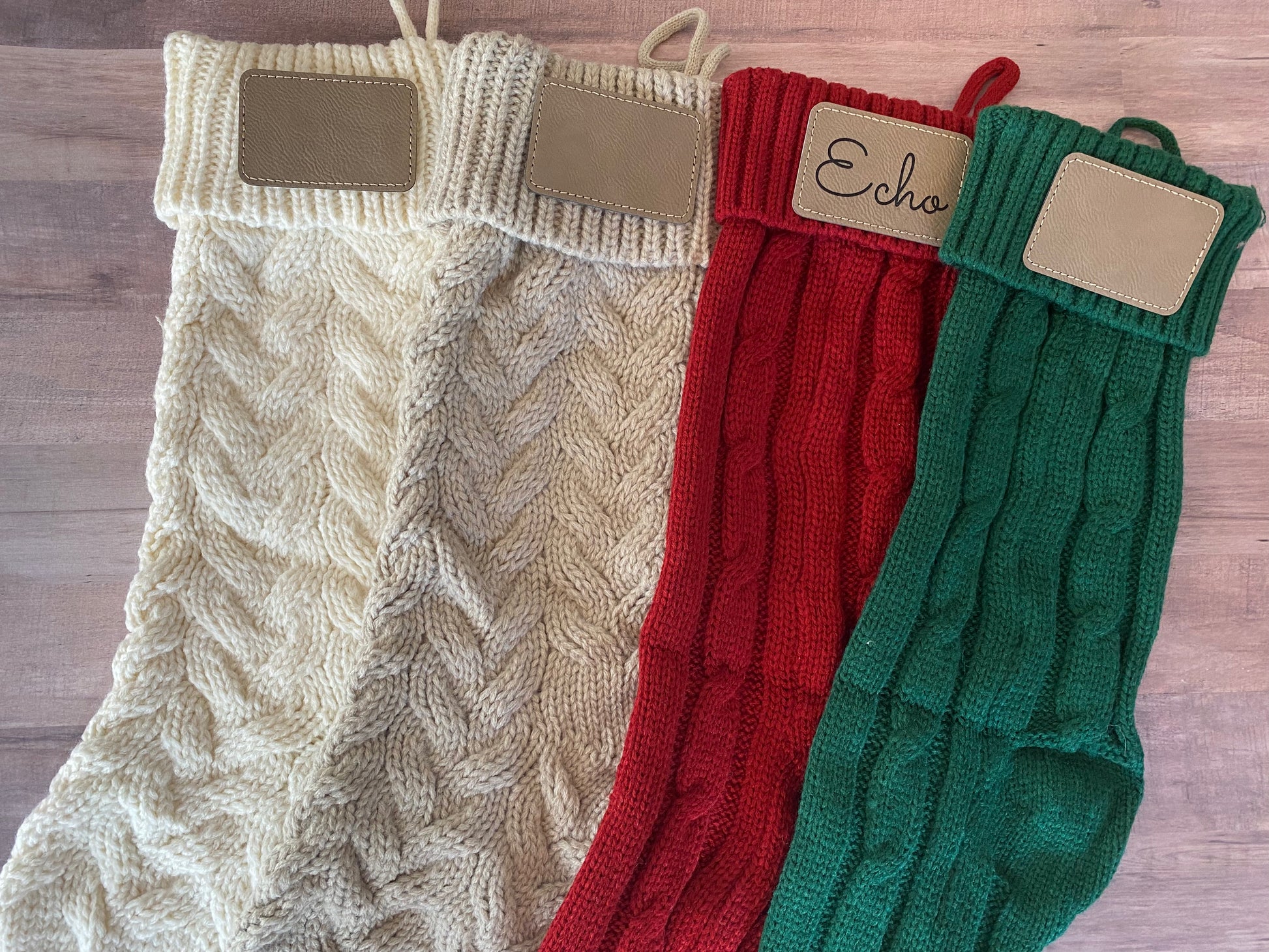 These knit stockings will go well on any mantle. They are 18 inches long and 5 inches wide. Name is engraved on a leather patch. When adding name to personalization follow it with a 1 or a 2 to note font choice.