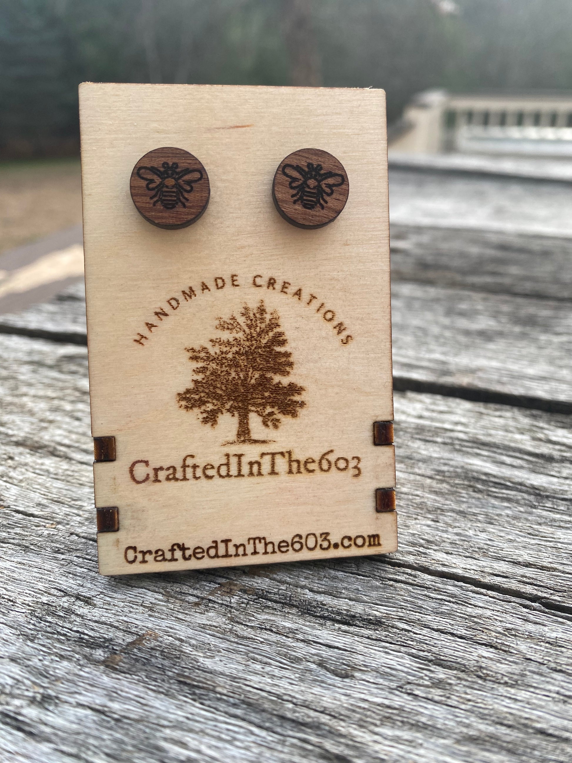 How cute are these Bee themed studs. They are made of Sapele wood.