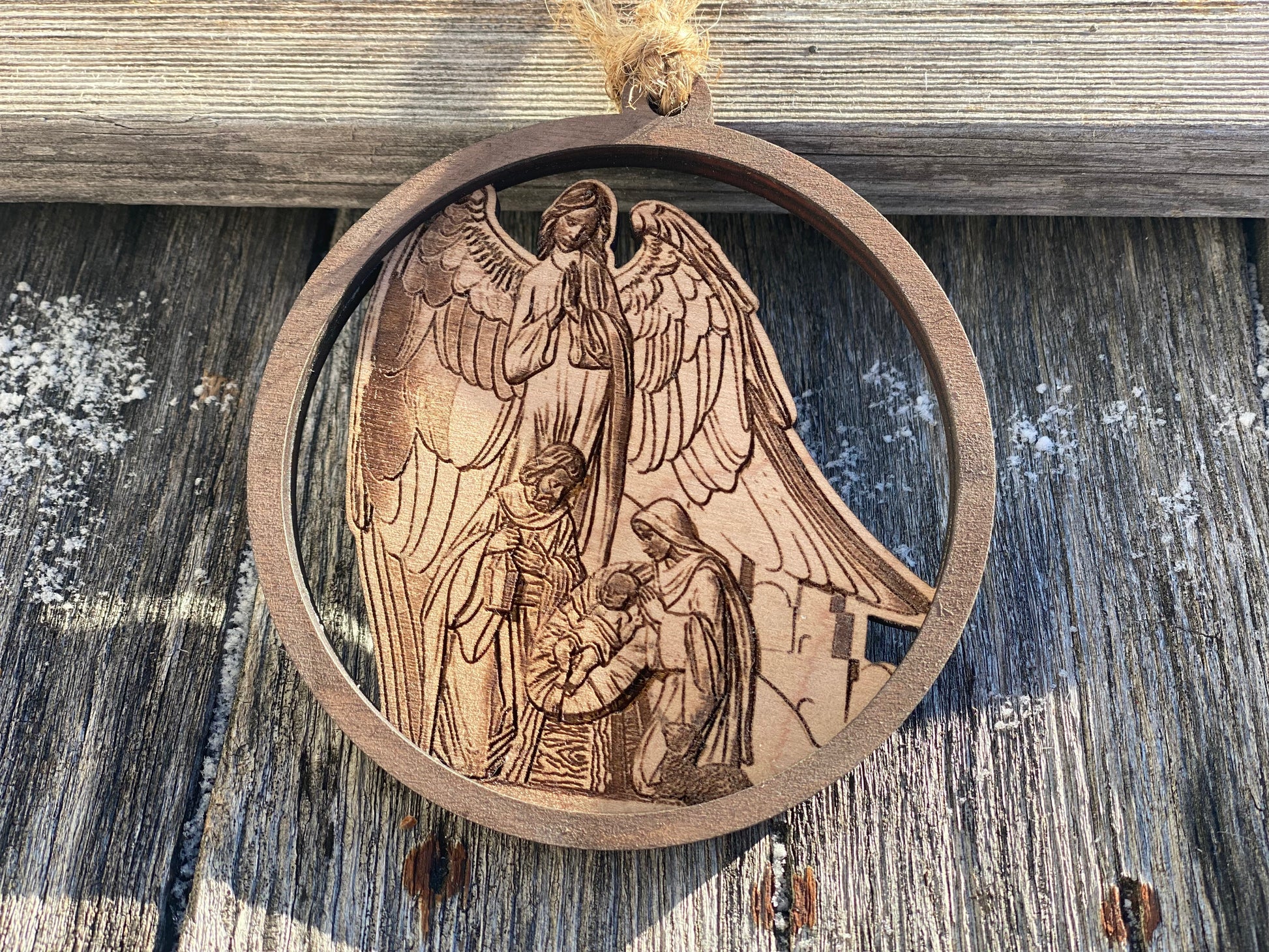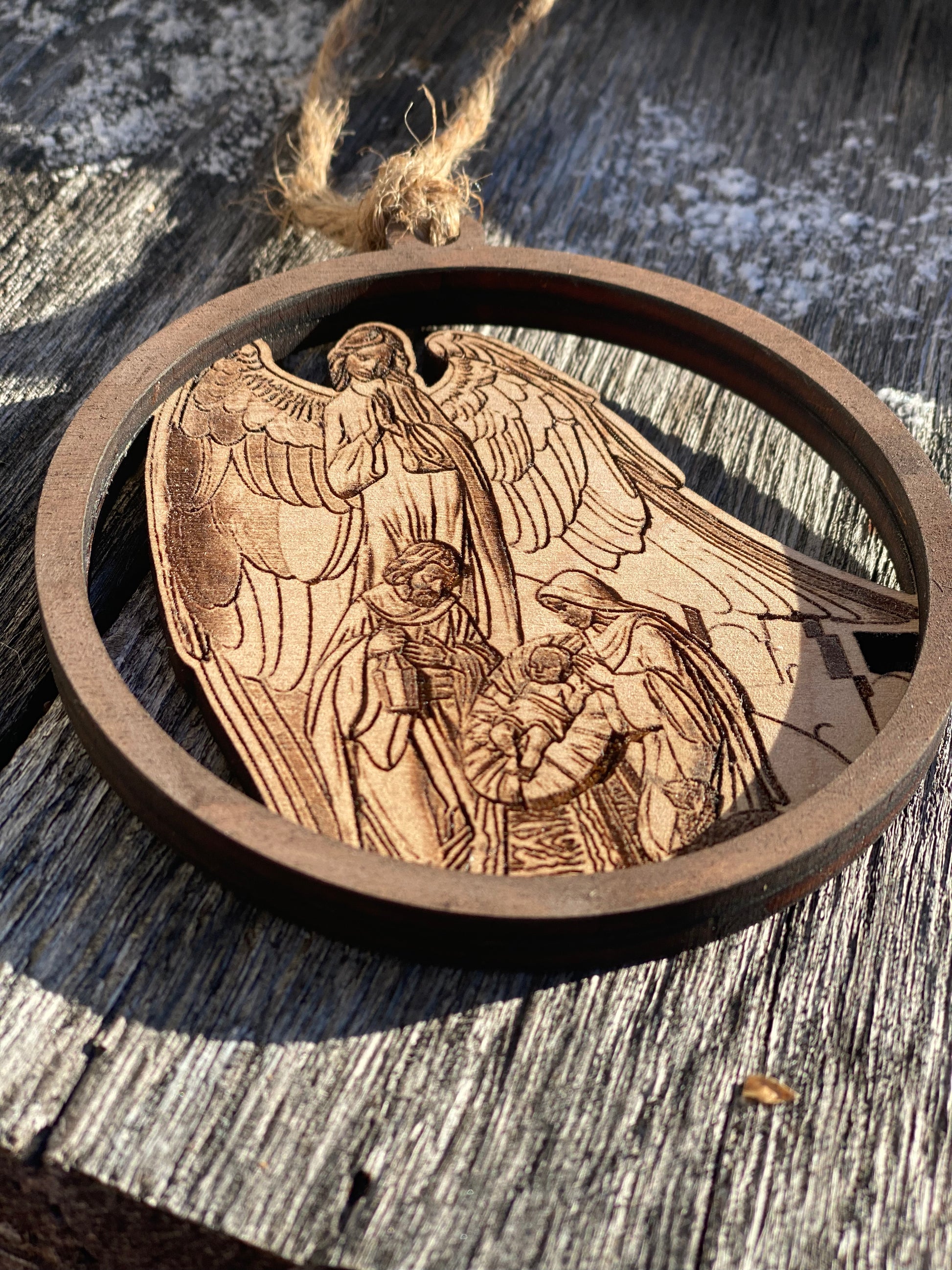 Laser cut double layer laser engraved wooden nativity scene ornament.