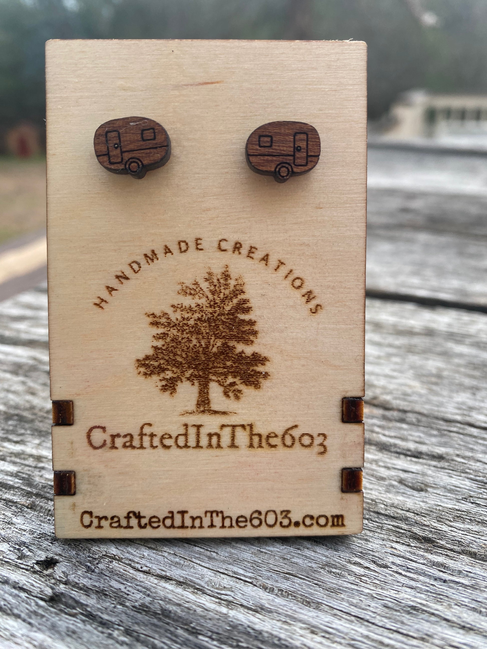 Adorable Camper stud earrings made of Sapele wood.